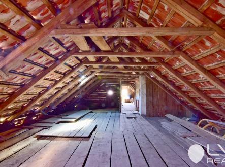 Půda je prostorná, čistá a má dostatečnou světlou výšku pro vestavbu dalších místností, pokud byste chtěli.
